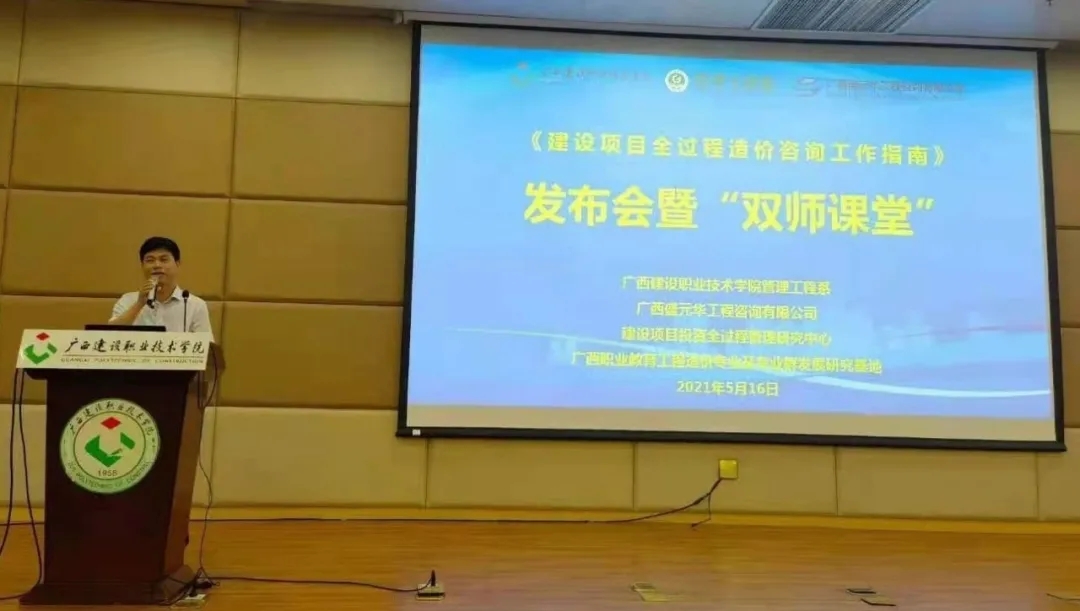 5月16日上午,廣西盛元華工程咨詢有限公司與廣西建設(shè)職業(yè)技術(shù)學(xué)院管理工程系聯(lián)合舉辦的《建設(shè)項(xiàng)目全過(guò)程造價(jià)咨詢工作指南》發(fā)布會(huì)暨“雙師課堂”活動(dòng)在廣西建設(shè)職業(yè)技術(shù)學(xué)院學(xué)術(shù)報(bào)告廳隆重舉行。 廣西建設(shè)職業(yè)技術(shù)學(xué)院副院長(zhǎng)柏挺、廣西壯族自治區(qū)建設(shè)工程造價(jià)站站長(zhǎng)陳挺、廣西建設(shè)工程造價(jià)管理協(xié)會(huì)會(huì)長(zhǎng)唐家球、廣西盛元華工程咨詢有限公司董事長(zhǎng)方元煥等領(lǐng)導(dǎo);廣聯(lián)達(dá)科技股份有限公司、廣西建工集團(tuán)控股有限公司、廣西瑞真工程造價(jià)咨詢有限責(zé)任公司、祥浩工程造價(jià)咨詢有限責(zé)任公司、廣西火天信投資集團(tuán)、建銀工程咨詢有限責(zé)任公司等行內(nèi)知名企業(yè)的嘉賓出席發(fā)布會(huì)?!豆ぷ髦改稀肪帉?xiě)團(tuán)隊(duì)、管理工程系造價(jià)團(tuán)隊(duì)全體教師及2019級(jí)工程造價(jià)(全過(guò)程管理方向)專業(yè)學(xué)生參加了本次活動(dòng)。