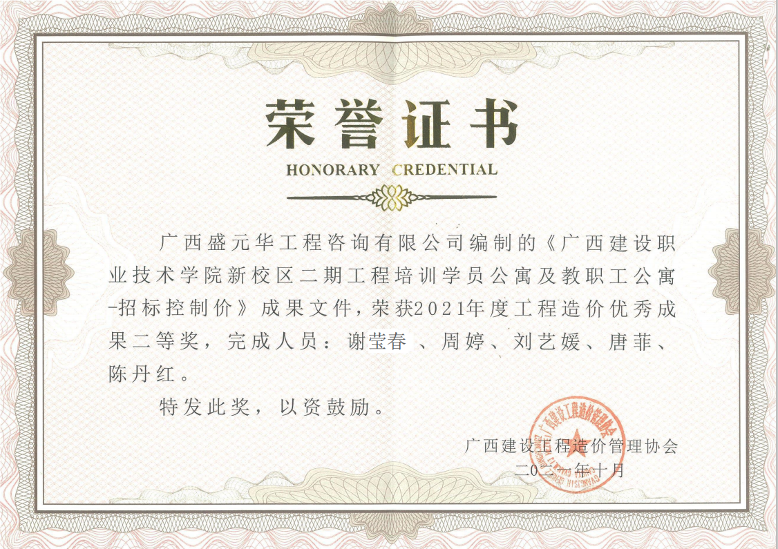 大會(huì)表彰了榮獲2021年度廣西建設(shè)工程造價(jià)優(yōu)秀成果獎(jiǎng)的65家單位,其中我公司編制的《廣西建設(shè)職業(yè)技術(shù)學(xué)院新校區(qū)二期工程培訓(xùn)學(xué)員公寓及教職工公寓——招標(biāo)控制價(jià)》成果文件,榮獲2021年度廣西建設(shè)工程造價(jià)優(yōu)秀成果獎(jiǎng)二等獎(jiǎng)。據(jù)悉,我公司已有多個(gè)項(xiàng)目連年獲得廣西建設(shè)工程造價(jià)優(yōu)秀成果獎(jiǎng)。