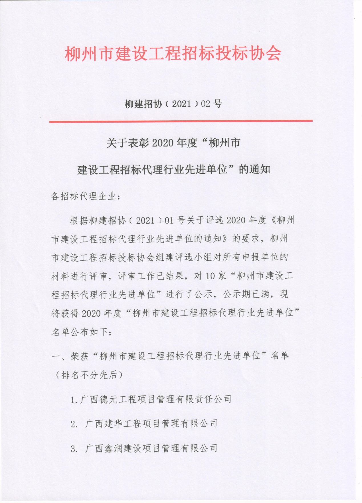 | 喜訊!熱烈祝賀廣西盛元華集團旗下柳州一分公司榮獲2020年度"柳州市建設(shè)工程招標代理行業(yè)先進單位"的榮譽稱號 |